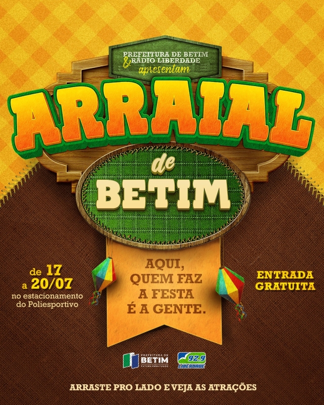 O Arraial de Betim, tem parceria com a Rádio Liberdade FM. Serão 4 dias de festa com muita música ao vivo, comidas típicas, decoração temática, quadrilhas tradicionais e muita animação. Vale muito a pena participar!
