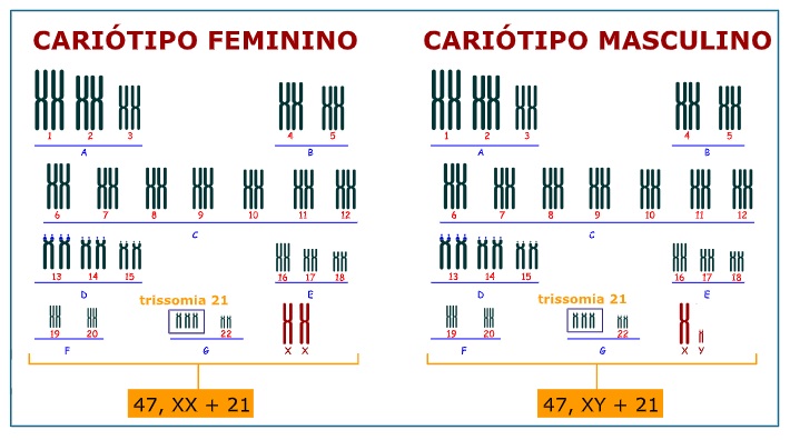 Assim, o portador da Síndrome de Down, ao invés de 46 cromossomos, sendo 44 autossomos + 2 cromossomos sexuais, ou 22 pares de cromossomos autossômicos + 1 par de cromossomos sexuais, possui 47 cromossomos, um comossomo a mais do que deveria, no par de cromossomos 21, ou seja o cromossomo 21 possui três homólogos ao invés de dois.